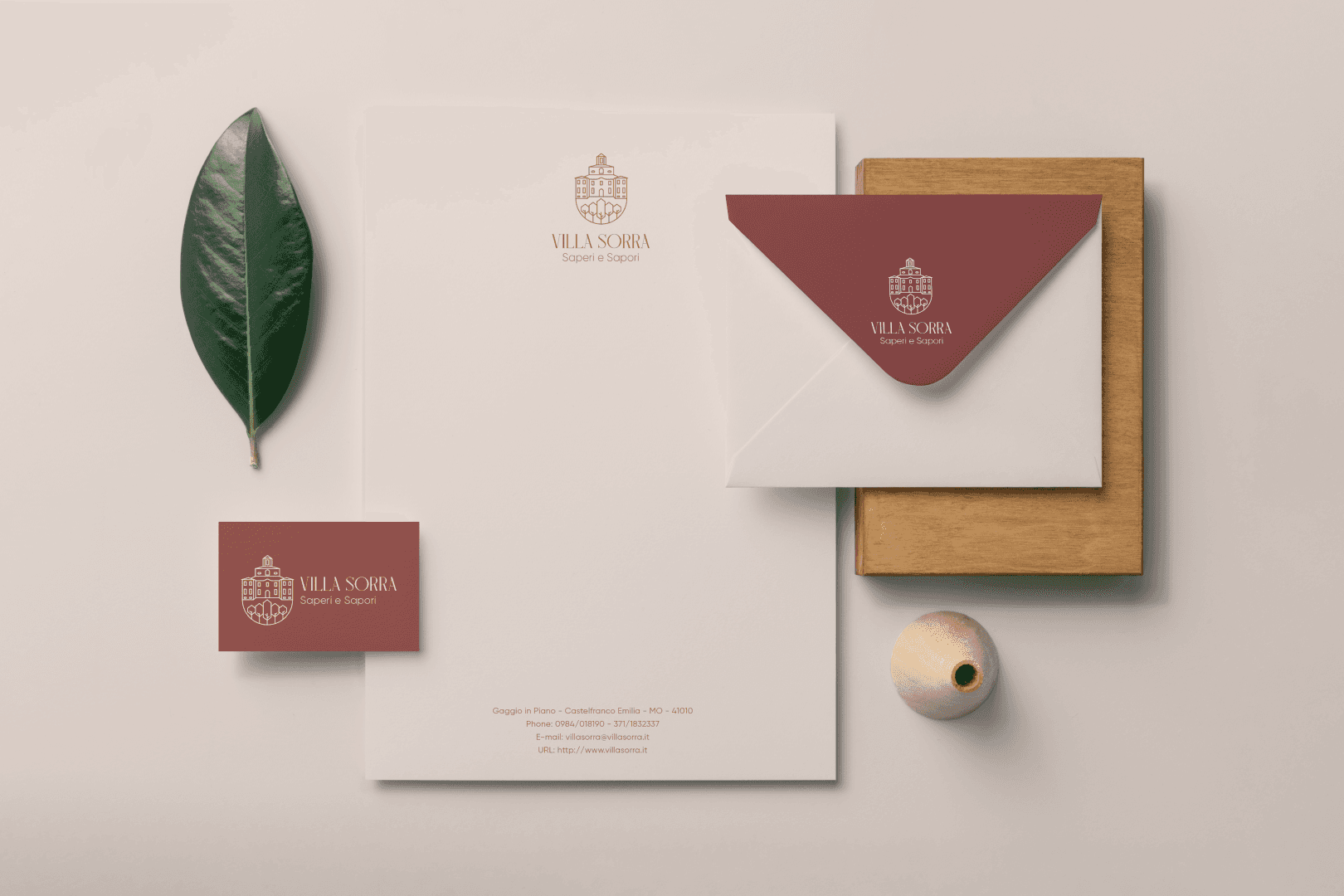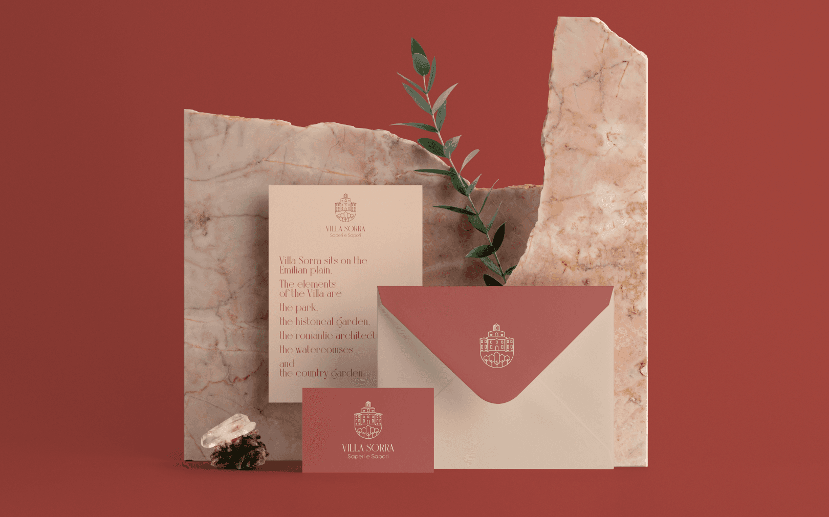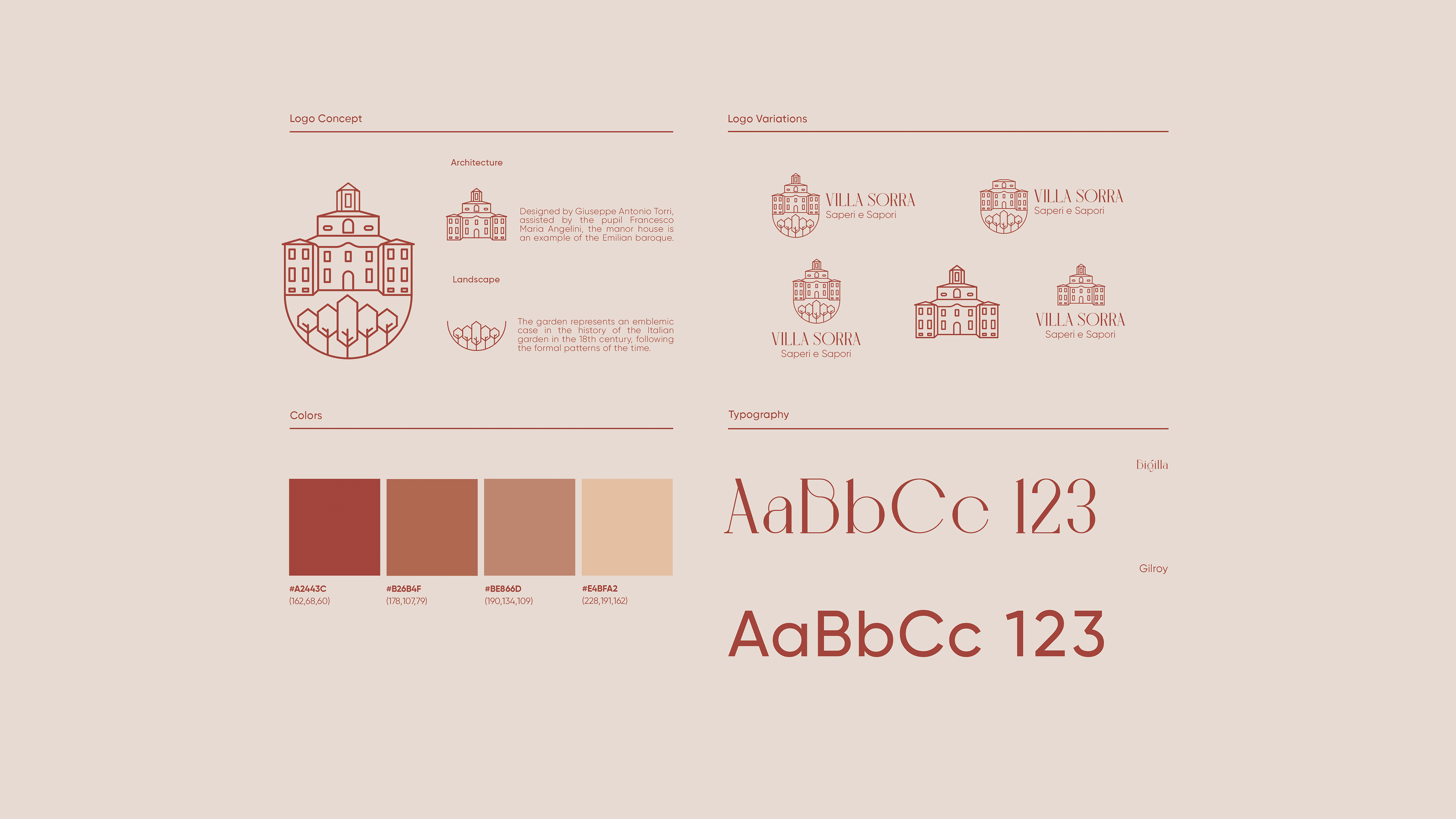 The color system appears to draw directly from the villa’s architectural and environmental context. Warm terracotta tones reference traditional Italian facades.